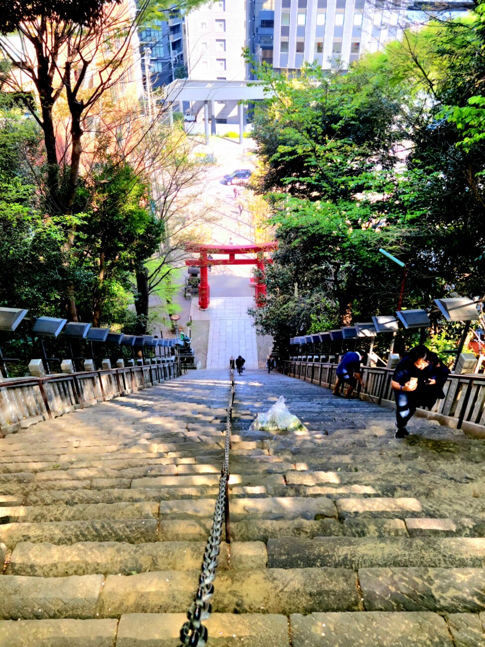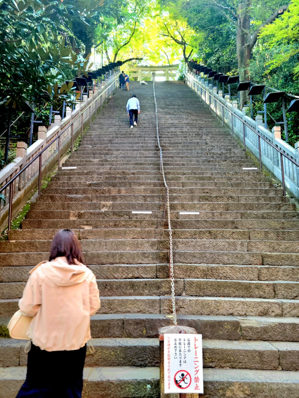 非常に急斜面かつ86段もの石段が連なるため、普段運動不足の方はなかなかハード。