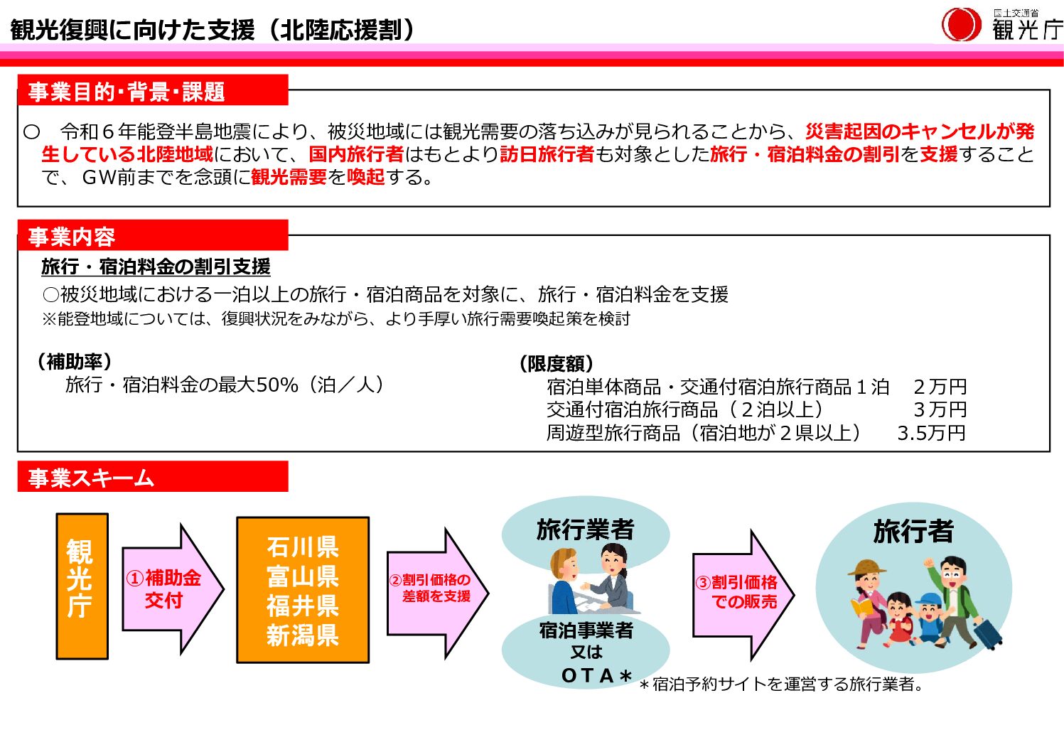 令和6年能登半島地震により、被災地域には観光需要の落ち込みが見られることから、災害起因のキャンセルが発生している北陸地域において、国内旅行者はもとより訪日旅行者も対象とした旅行・宿泊料金の割引を支援することで、GW前までを念頭に観光需要を喚起します。