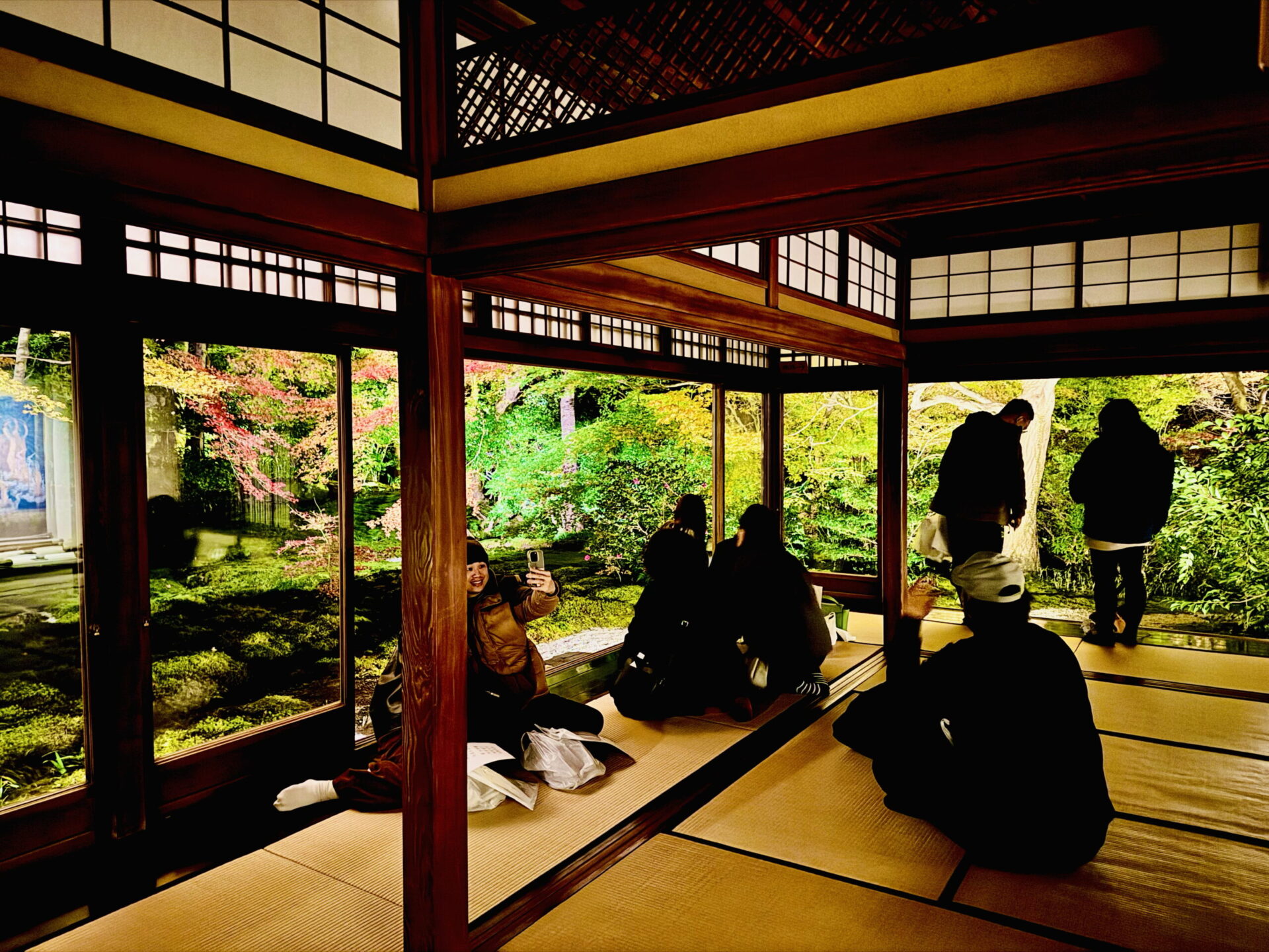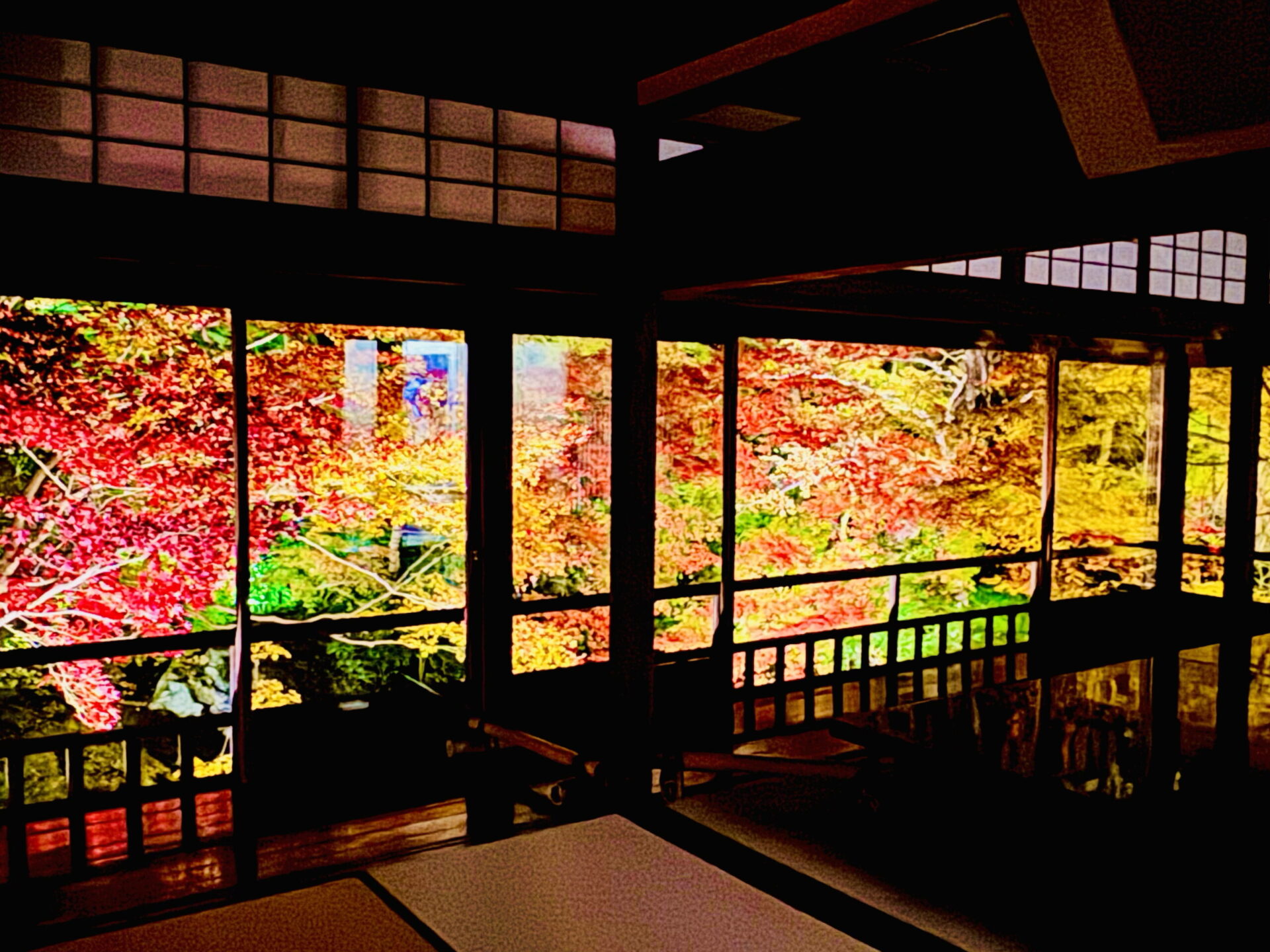 畳と床板が鏡のように紅葉を映し出し、足元まで赤や橙のグラデーションが広がります。