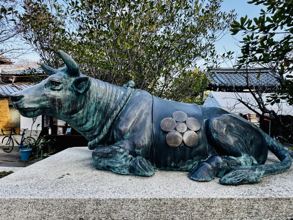 境内には天神さまの使いである牛の像があり、頭をなでることで知恵を授かり、体の悪いところをなでると快復すると信じられている