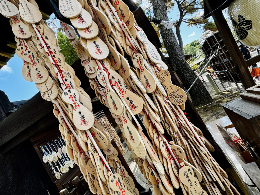 • 願い方 : 絵馬に願い事を書いたあと、境内にある絵馬掛けに吊るす一般的な作法。たくさんのひょうたんが並ぶ様子はまさに秀吉の代名詞である「千成びょうたん」そのもの