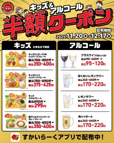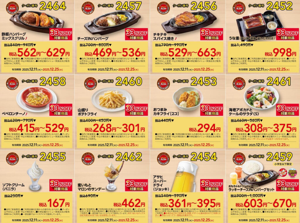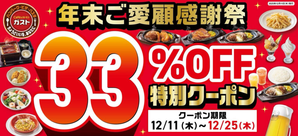 2025年12月、ガストが年末感謝企画として人気メニューを最大33%割引になるクーポンを配布中です。